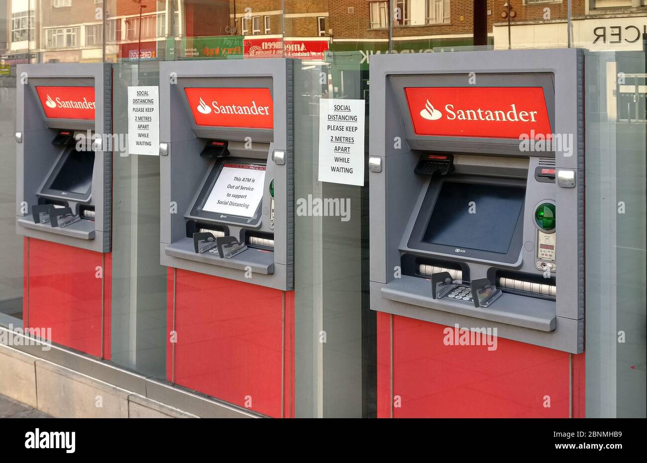 London United Kingdom April 09 2020 Three Santander Bank Atm Withdrawal Terminals With Middle One Disabled To Support Social Distancing During Co Stock Photo Alamy